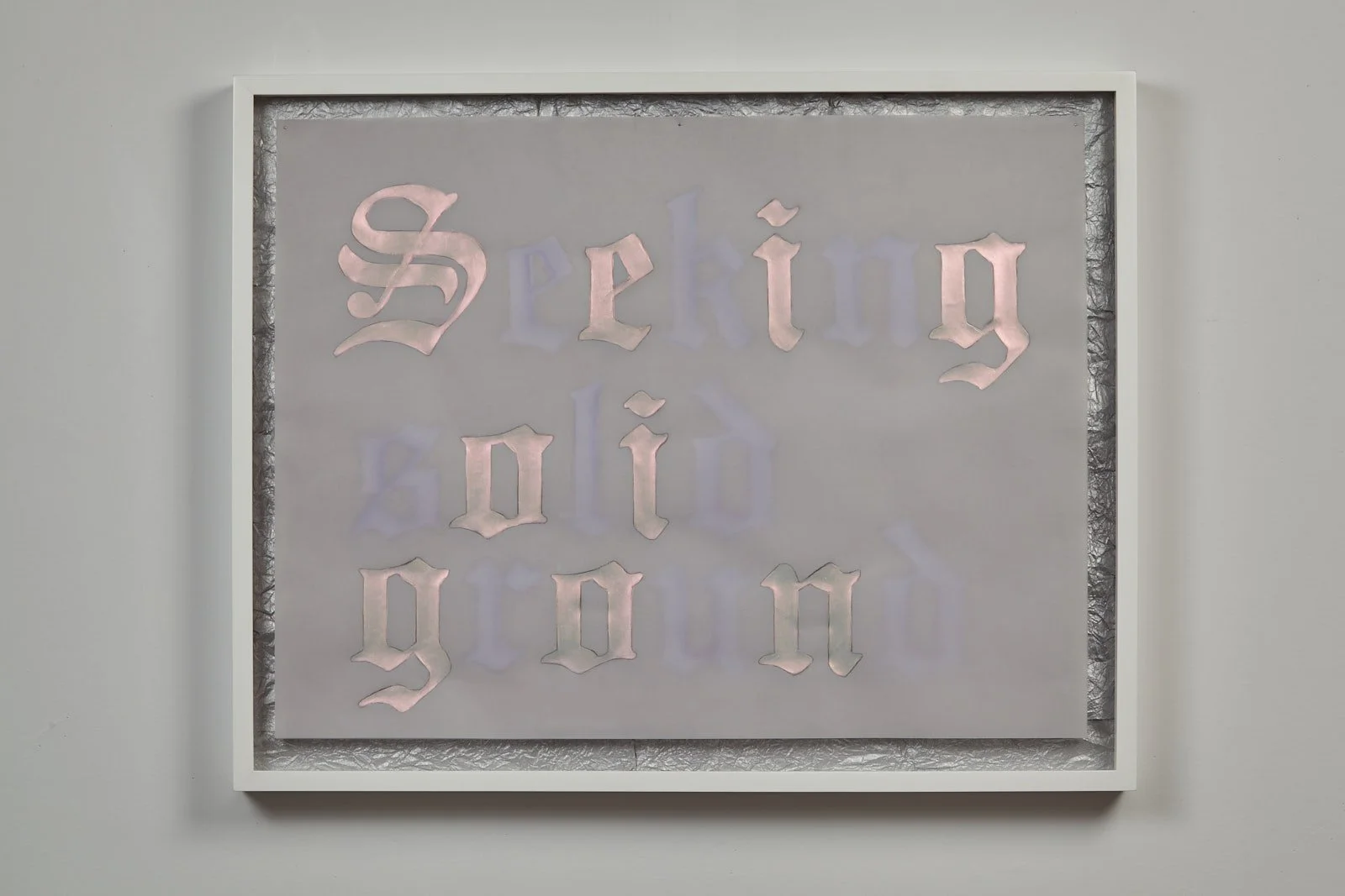 Figure ground, Fautrier, Interference paint and watercolor pencil on two sheets of Opalux vellum, over silver Momi paper, 22.25 x 28 x 2.25 inches, framed, 2020