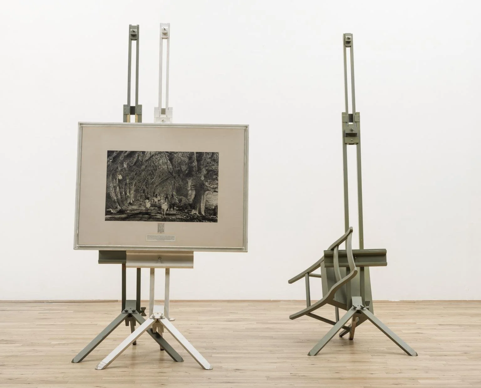 Tony Carter, Virus — Of War and Subjective Seeing , Three easels, painted wooden chair and oil paint on photographic print with printed text, Dimensions variable, 1979-82, Tate , U.K.